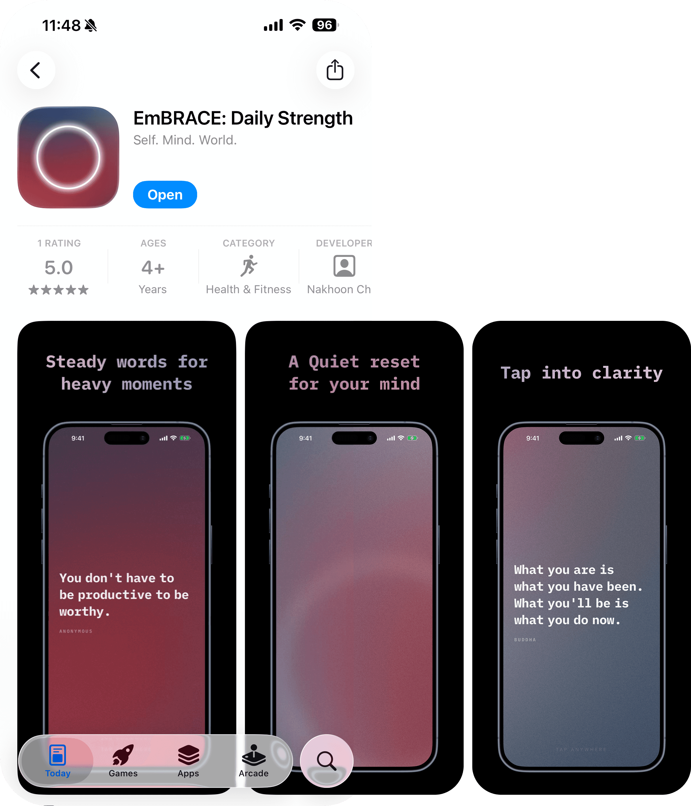Embrace is a minimal, ambient encouragement app designed to help users reset emotionally in moments of stress or uncertainty. With a single tap, it delivers short, curated messages through a calm, immersive interface - focusing on clarity, confidence, and mental grounding.