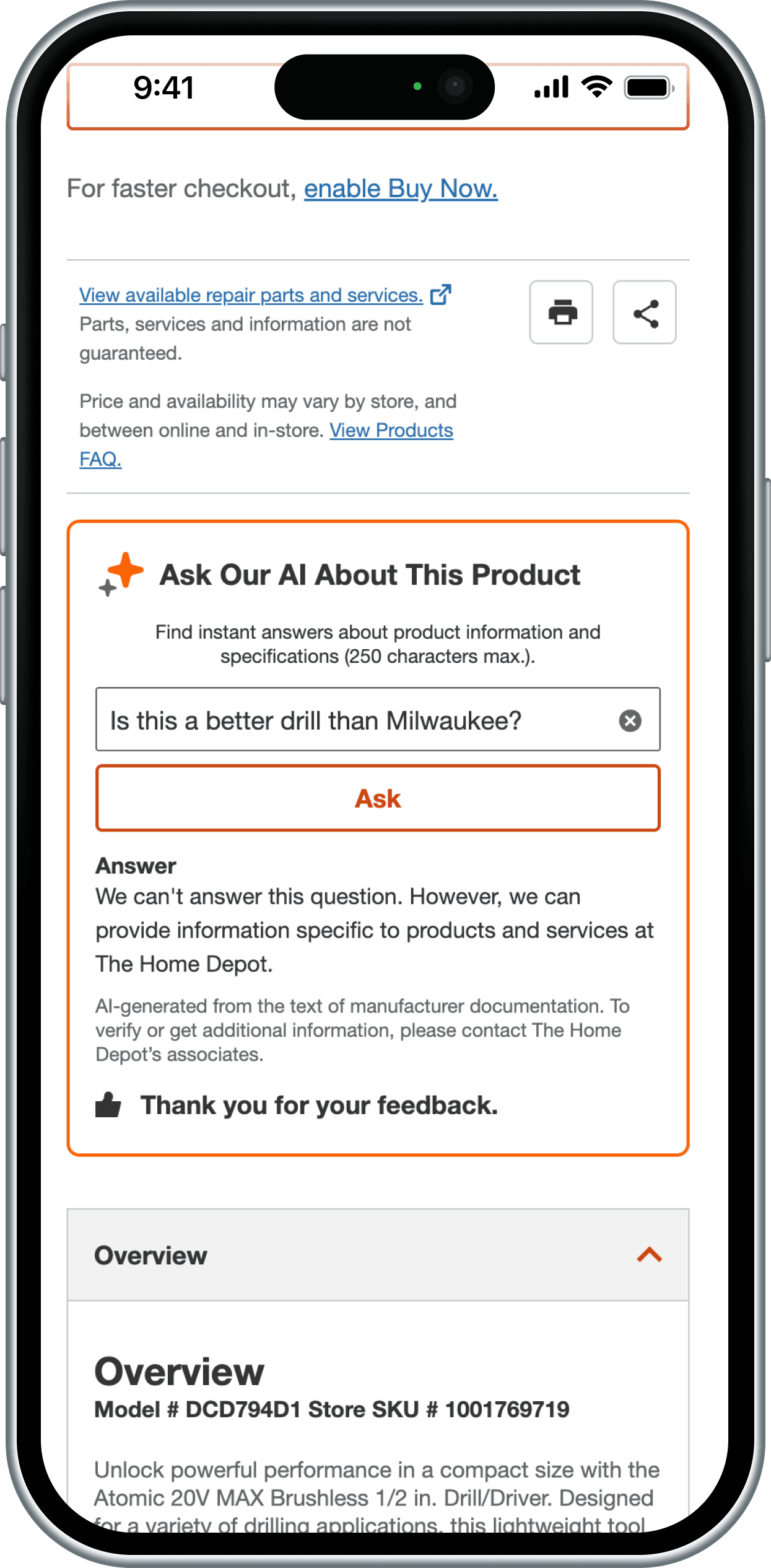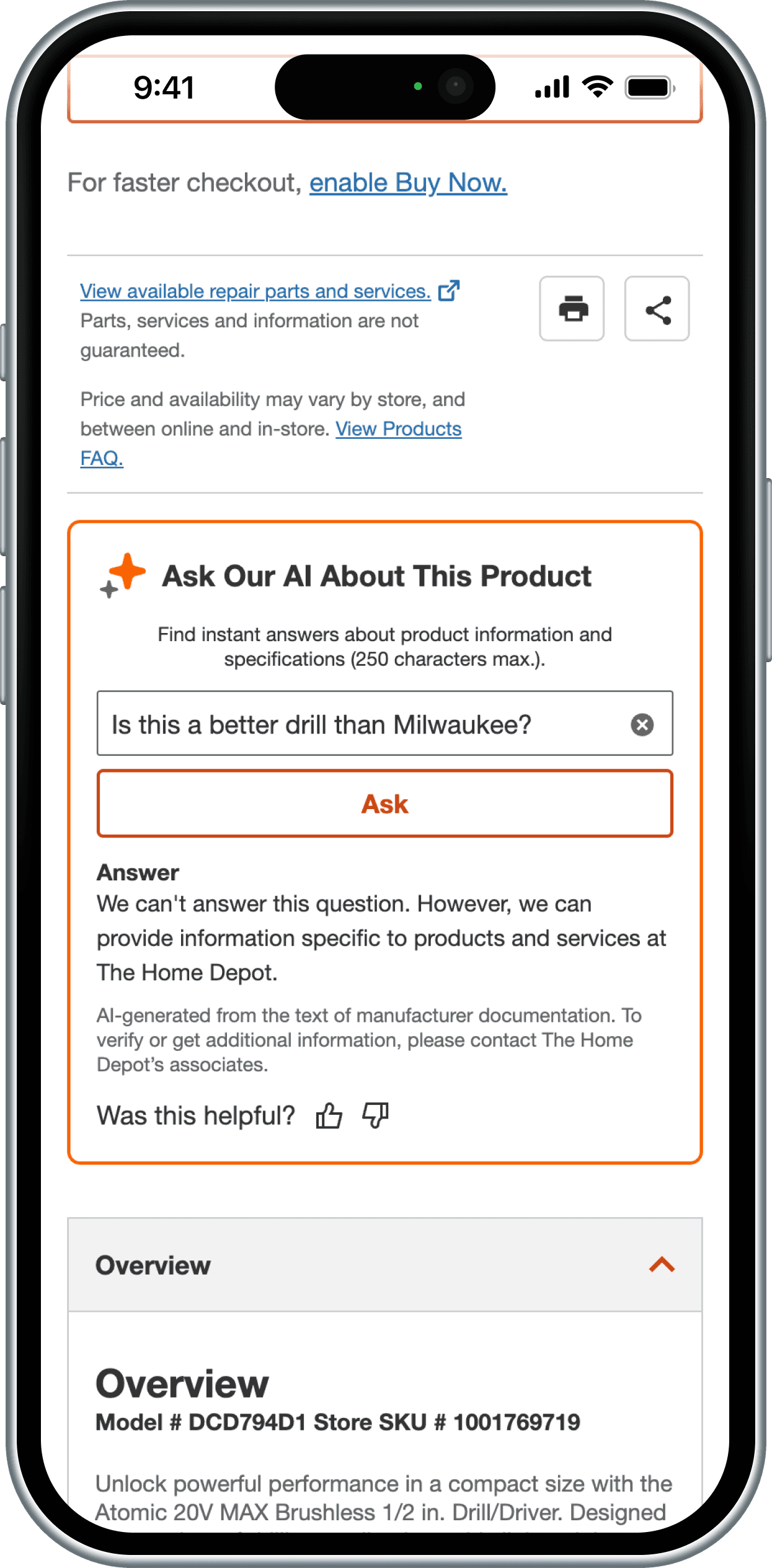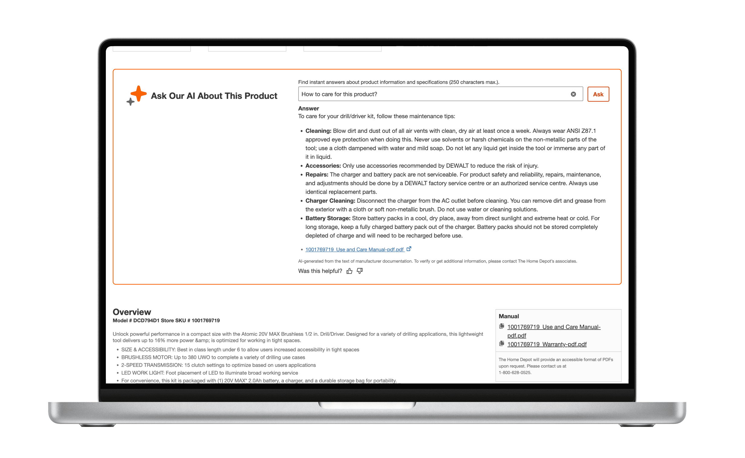 is an AI-powered Q&A tool that delivers associate-like product guidance online, helping customers quickly and easily find accurate, relevant information and make confident purchase decisions.