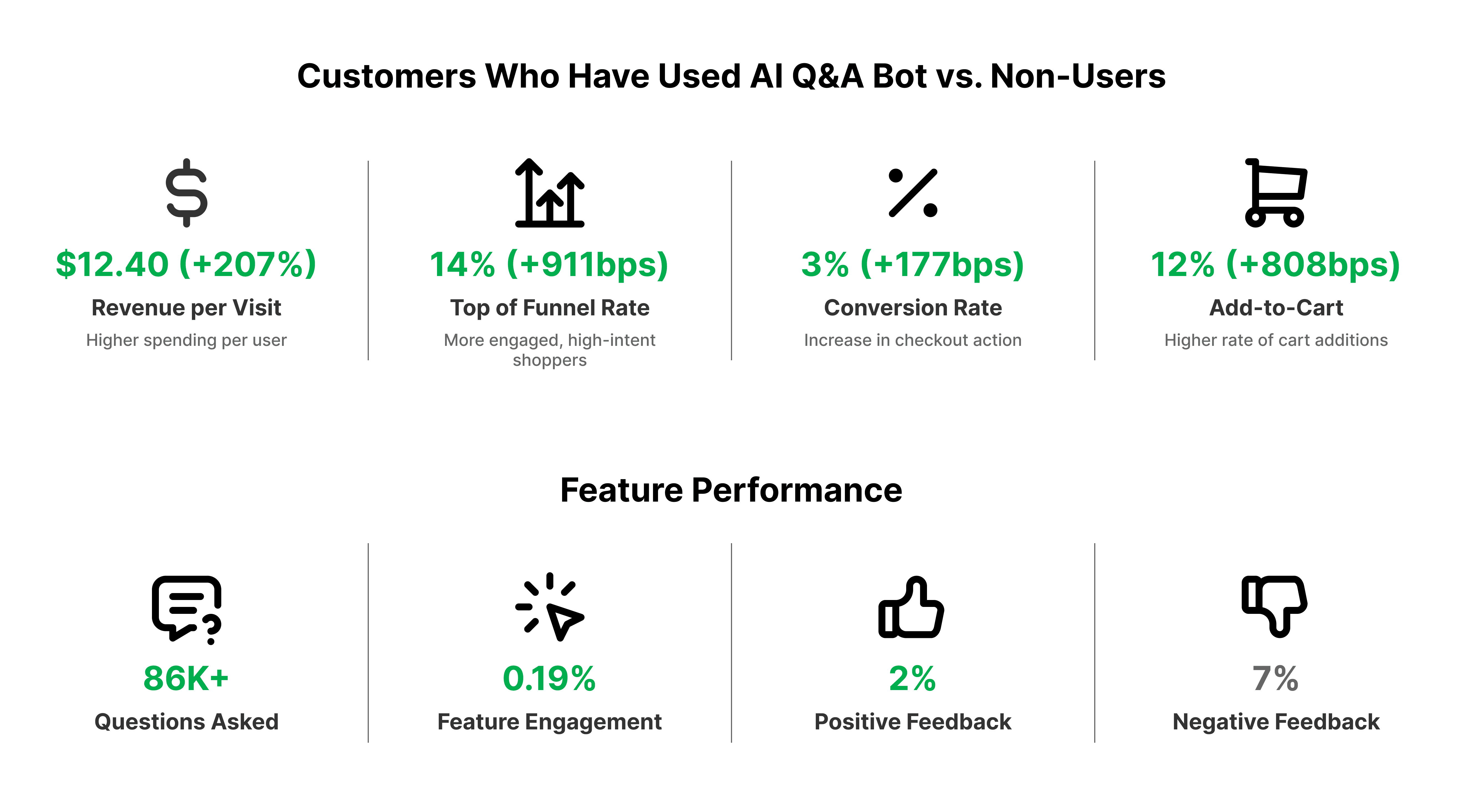 After a one-week internal pilot, we rolled Magic Apron AI Q&A Bot into a month-long 50/50 A/B test to validate real customer impact. The results showed that when customers discovered and used the bot, it positively influenced the shopping journey: increasing confidence, reducing friction in finding product details, and supporting more decisive actions on product pages.