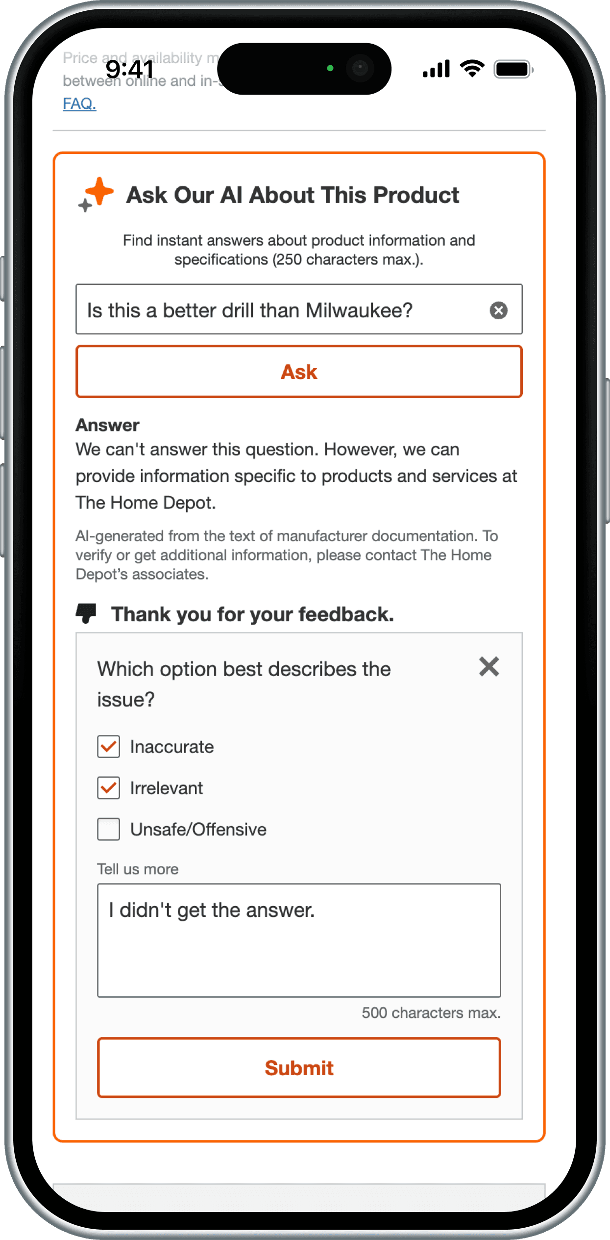 This project required deep collaboration across UXR, Product, Data Science, Engineering, UXW, Legal, and Design Ops teams, aligning with Home Depot’s broader AI strategy.