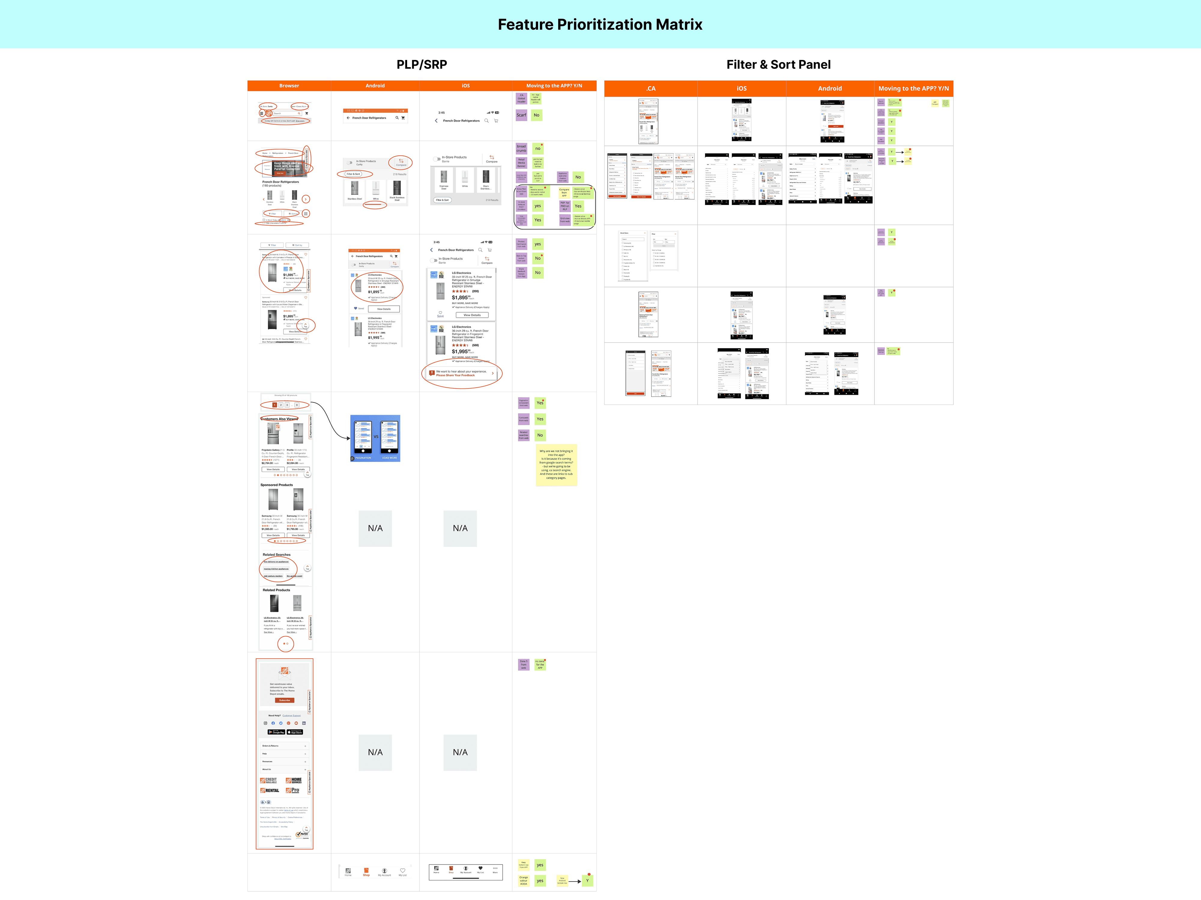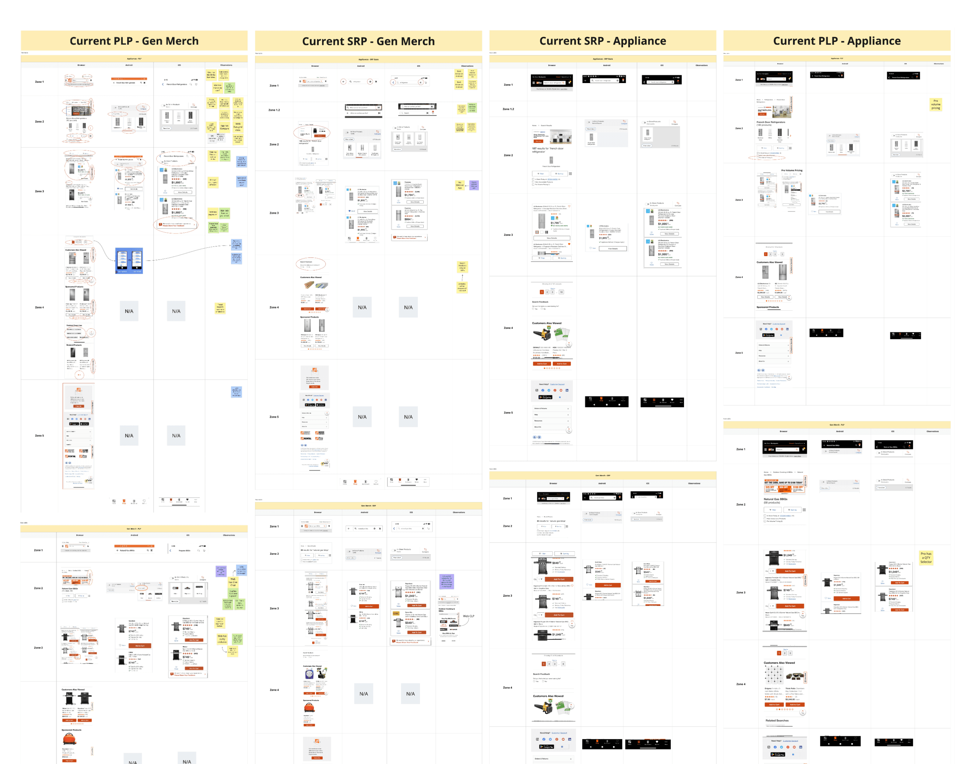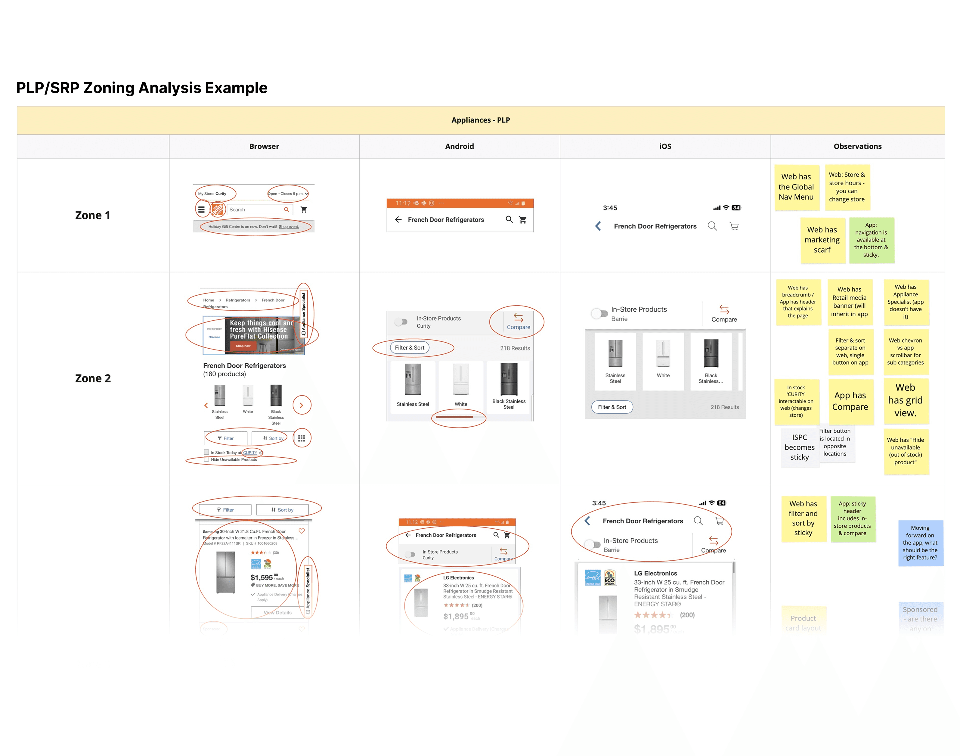 We began by breaking down key screens (PIP, PLP, SRP) into zones and comparing experiences across mobile web, iOS, and Android.