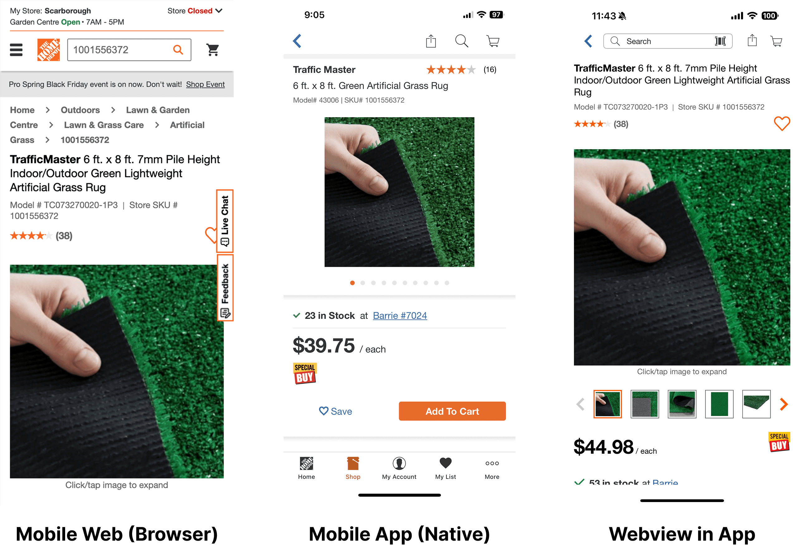 The Product Information Page (PIP) and Product Listing/Search Results Page (PLP/SRP) Webview projects were UX initiatives aimed at closing the experience gap between The Home Depot mobile app and mobile web experience. While each project focused on different parts of the customer journey, they shared a common goal: to bring feature parity and consistency across platforms, ensuring that customers - whether DIYers, PROs, or guest users - could shop with ease, regardless of channel.