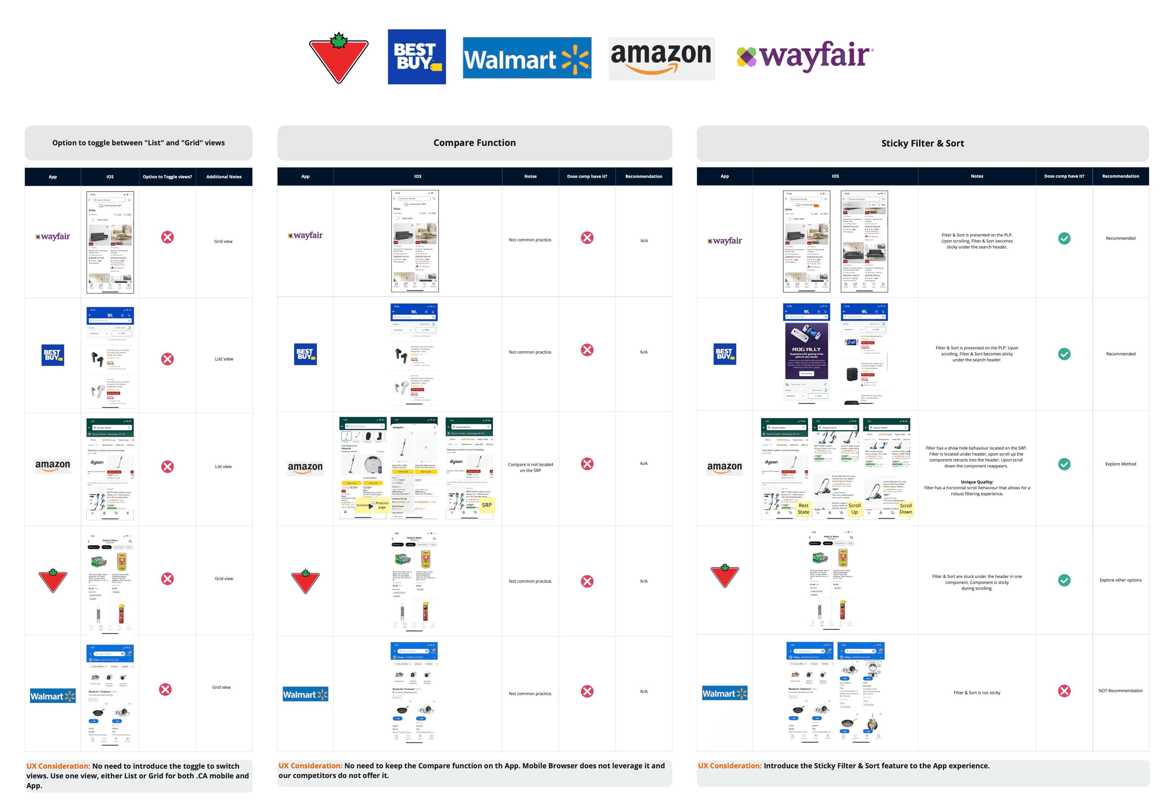 We reviewed competitor mobile experiences (apps + mobile web), including Amazon, Wayfair, and Walmart, to benchmark layout structure, navigational patterns, and use of WebView. This helped validate our assumptions and identify gaps in our current experience, particularly around filters, breadcrumbs, and persistent navigation.
